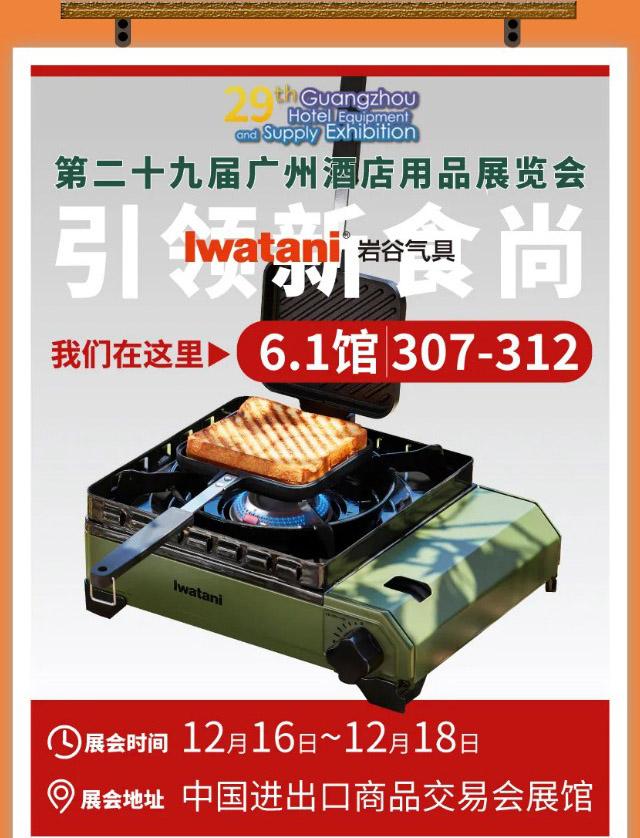 非常感謝您對巖谷氣具(珠海)有限公司長期以來的大力支持,我司參加了第二十七屆廣州酒店用品展。本次展會我司隆重推出了幾款新產品,展會設計與往屆不同有所創(chuàng)新,展示世界美食、戶外系列等,恭迎各位蒞臨指導。